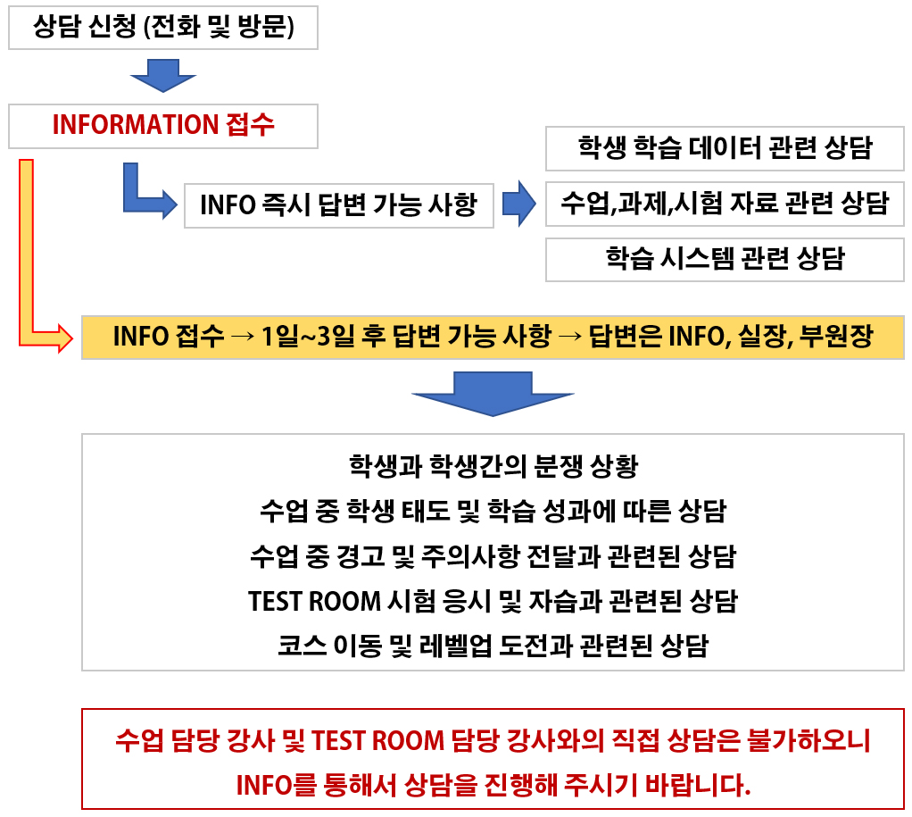3. ¼ö¾÷À» ´ã´çÇÏ´Â ¼±»ý´Ô ¹× TEST ROOM À» ´ã´çÇÏ´Â ¼±»ý´Ô°úÀÇ Á÷Á¢ÀûÀÎ »ó´ãÀÌ ºÒ°¡ÇÕ´Ï´Ù. ¼ö¾÷À» ´ã´çÇÏ´Â ¼±»ý´ÔÀº ¼ö¾÷ ¹× °úÁ¦¿¡ °ü·ÃµÈ ¾÷¹«¸¸À» Àü´ãÇÏ¸ç »ó´ãÀº ÇÏÁö ¾Ê½À´Ï´Ù. TEST ROOM ´ã´ç ¼±»ý´Ôµµ µ¿ÀÏÇÕ´Ï´Ù. ÀÌ¿¡ ´ëÇÑ ³»¿ë Àü´Þ¿¡¼ °£È¤ ¡°Çпø°úÀÇ »ó´ãÀÌ ºÒ°¡ÇÏ´Ù¡± ¶ó°í ¿ÀÇØÇϽô ºÐµéÀÌ °è½Ê´Ï´Ù. Çпø°úÀÇ »ó´ãÀº ¾ðÁ¦³ª °¡´ÉÇÕ´Ï´Ù. ´ÜÁö INFO ¸¦ ÅëÇØ¼ °£Á¢ »ó´ã¸¸ °¡´ÉÇÑ °ÍÀÔ´Ï´Ù.
